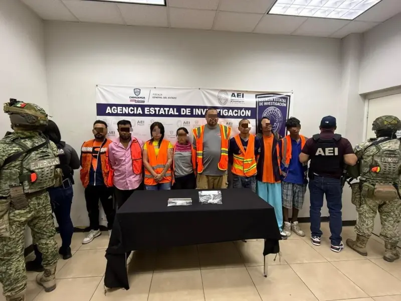 CHIHUAHUA, Chih., 18 de abril de 2026.-Elementos de la Agencia Estatal de Investigación (AEI), adscritos al Centro de Operaciones Estratégicas (COE), cumplimentaron una orden de cateo en un inmueble de la calle Montes Himalaya de la colonia La Cuesta II, en donde ocho personas fueron detenidas en flagrancia por delitos contra la salud.