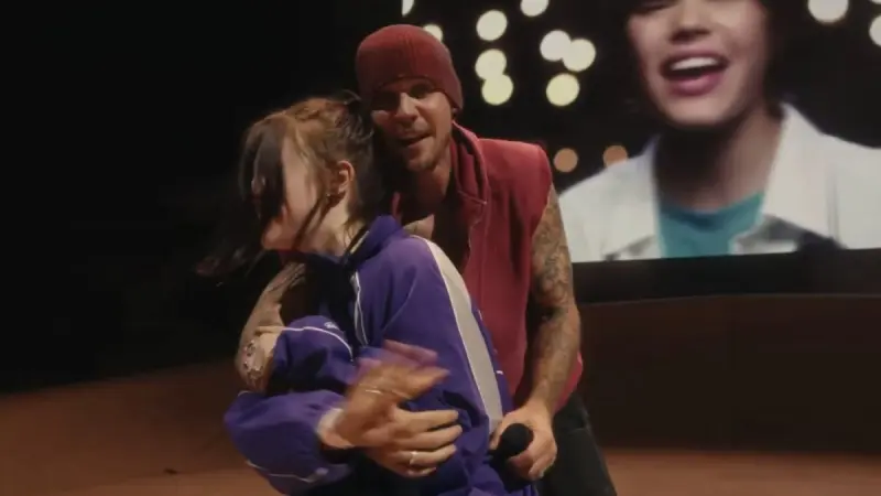 Justin se acercó a ella con cariño, la abrazó con fuerza y continuó cantándole directamente, mirándola a los ojos mientras ella procesaba lo que estaba ocurriendo.