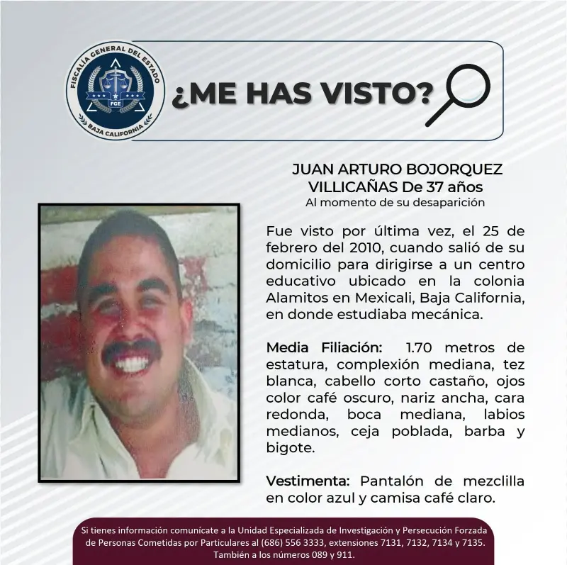Mexicali, B.C.– A más de una década de su desaparición, autoridades mantienen activa la búsqueda de Juan Arturo Bojorquez Villicañas, quien fue visto por última vez el 25 de febrero de 2010 en Mexicali.
