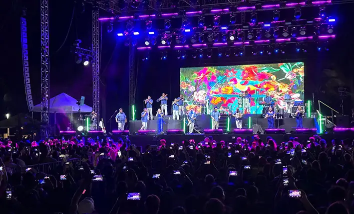 La fiesta arrancó puntualmente a las 21 horas, cuando la agrupación originaria de Iztapalapa salió al escenario para encender el ambiente con sus más grandes éxitos.