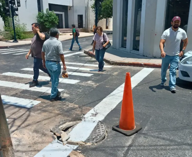 Un registro deteriorado que se localiza en la calle 56 con 59. Daños en tramos del centro de Mérida generan riesgos y afectan la circulación