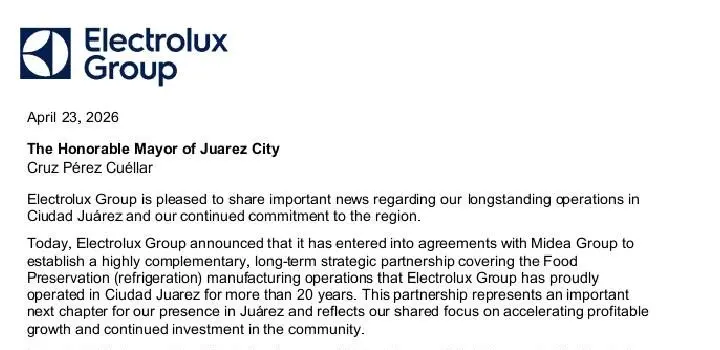 En la misiva enviada al Presidente Municipal, Electrolux Group informa que ha celebrado acuerdos con Midea Group para establecer una alianza estratégica de largo plazo, altamente complementaria, que abarca las operaciones de manufactura de Preservación de Alimentos (refrigeración) que Electrolux ha operado con orgullo en Ciudad Juárez durante más de 20 años.