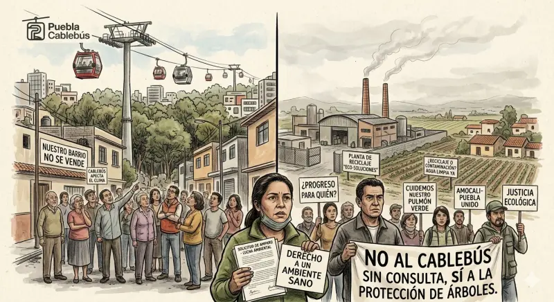 PUEBLA, Pue., 25 de abril de 2026.- El proyecto del cablebús y la recicladora en San José Chiapa son dos iniciativas del Gobierno de Puebla que han generado inconformidad en la población, prueba de ello es que ya existen amparos interpuestos en ambos casos. Mientras se busca la ampliación del amparo promovido por el Colectivo Hermanos Serdán para suspender el cablebús, el Movimiento en Defensa del Agua, la Tierra y la Vida de las Cuencas Libres Oriental interpuso el amparo 597/2026 en el Noveno Juzgado de Distrito en Puebla para detener el proyecto de la recicladora en San José Chiapa.