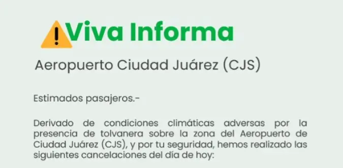 JUÁREZ, Chih., 26 de abril de 2026.- La aerolínea Viva Aerobus informó la cancelación de vuelos en el Aeropuerto Internacional de Ciudad Juárez (CJS) debido a condiciones climáticas adversas registradas en la zona.