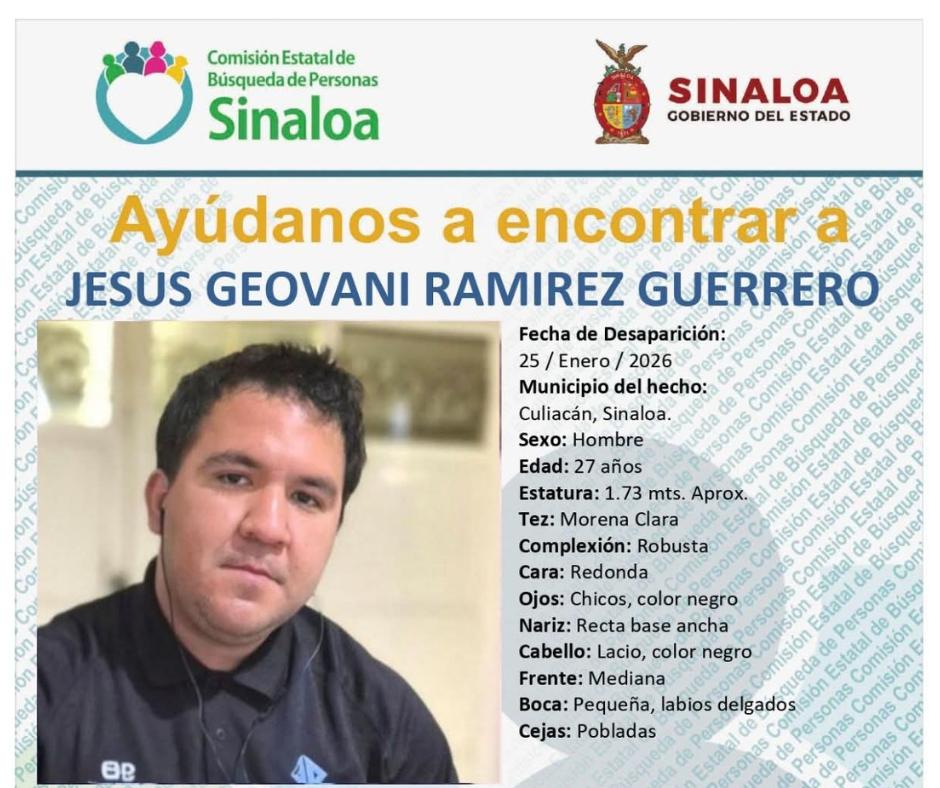 CULIACÁN. _ El domingo 25 de enero al mediodía, Jesús Geovani Ramírez Guerrero, de 27 años, salió de su casa en la colonia Miguel Hidalgo, para acudir a misa en el templo La Lomita, en Culiacán, pero ya no regresó a su hogar.